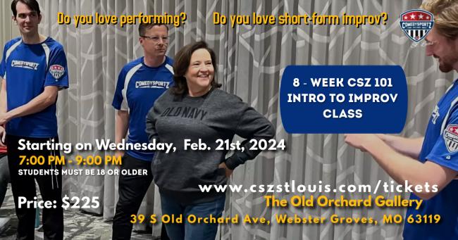 This class will help you practice the basic rules of Improv, while learning games to prepare you for future performances. Beginners will feel welcomed and supported while even experienced improvisers will get to polish their craft 8 - week class Dates: February 21st, 28th March 13th, 20th, 27th April 3rd, 10th, 17th Showcase: April 19th Price: $225 Where? The Old Orchard Gallery / 39 S Old Orchard Ave, Webster Groves, MO 63119. Questions? CSzStlouis@gmail.com