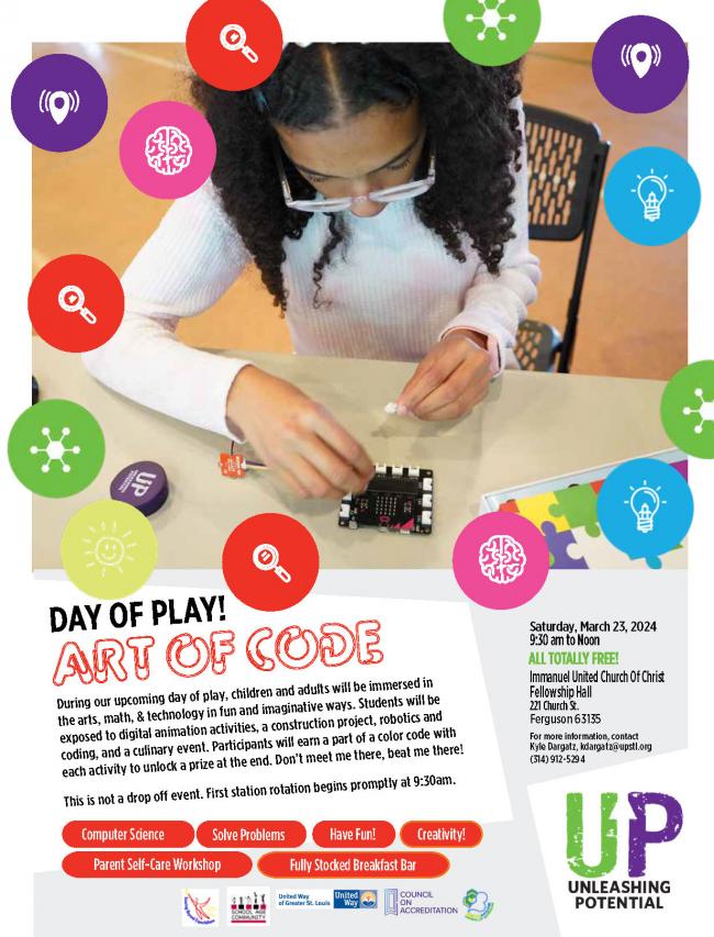 Join us for our Day of Play - Art of Code at Immanuel United Church of Christ, Ferguson MO from 9:30AM-Noon! Kids will be immersed in the arts, math & technology while parents will participate in “The Art of Movement”. Parents, be sure to wear comfortable clothing as we engage in yoga and West African Dance. Great door prizes in honor of Women's History Month. Hope to see you there!