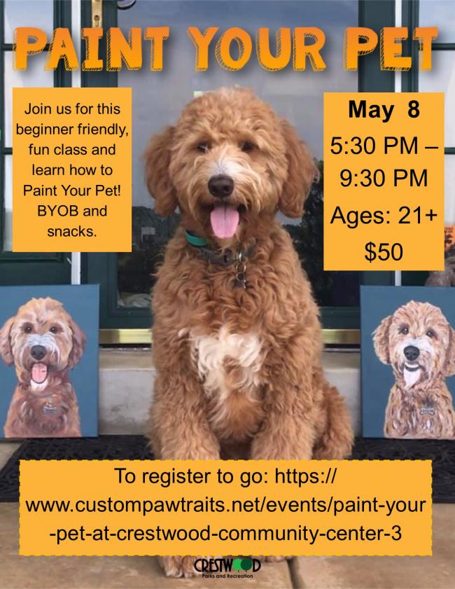 This class is completely beginner friendly, with step-by-step instructions presented by artist Hope Kieffer. You’ll take a seat in front of your canvas, pre-traced with your pet! Class will be similar to filling in a coloring book, no drawing required! We will provide paint, brushes, easels, and everything else you’ll need to produce a masterpiece and discover your inner artist! Come have some fun, and celebrate your pet! To register visit: https://www.custompawtraits.net/events/paint-your-pet-at-crestwood-commu...