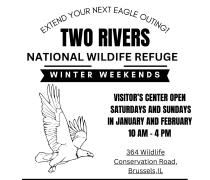 Join Two Rivers National Wildlife Refuge at the Visitor Center in Brussels every Saturday & Sunday in January & February! From 10 AM - 4 PM, watch for wild American bald eagles at the refuge with provided scopes and binoculars and enjoy complimentary hot cocoa on site! What better way to spend a winter weekend than observing America's national animal on the move!